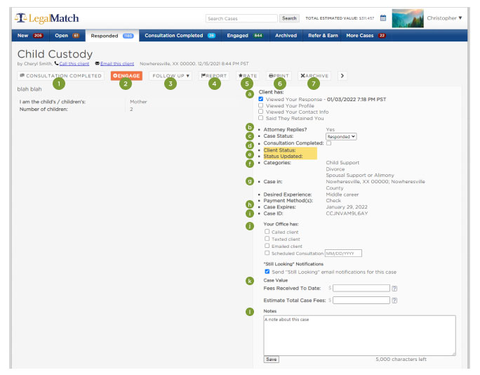 Additionally, this tab allows you to keep track of the potential client’s name and status, as well as your response time (the time between the client posting the case and you responding to their post).