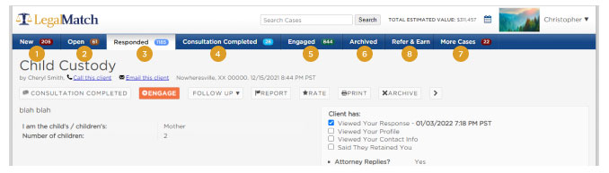 The Case Management section is the blue bar under the LegalMatch logo which has “tabs”. You can think of these tabs as similar to folders which you can use for grouping your cases accordingly.