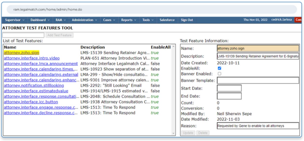 The E-Signature feature is enabled by default for all attorneys in the system although this is configurable via Attorney Test Feature as indicated below.
