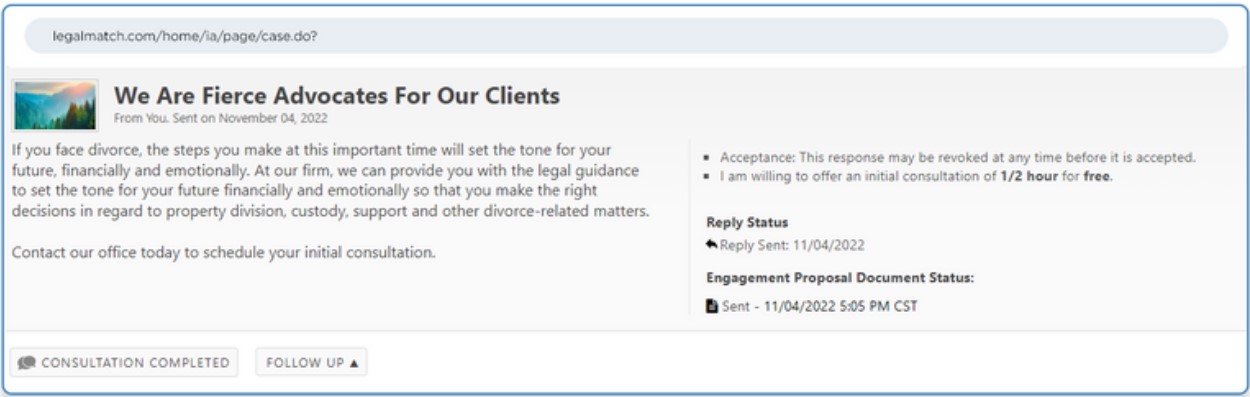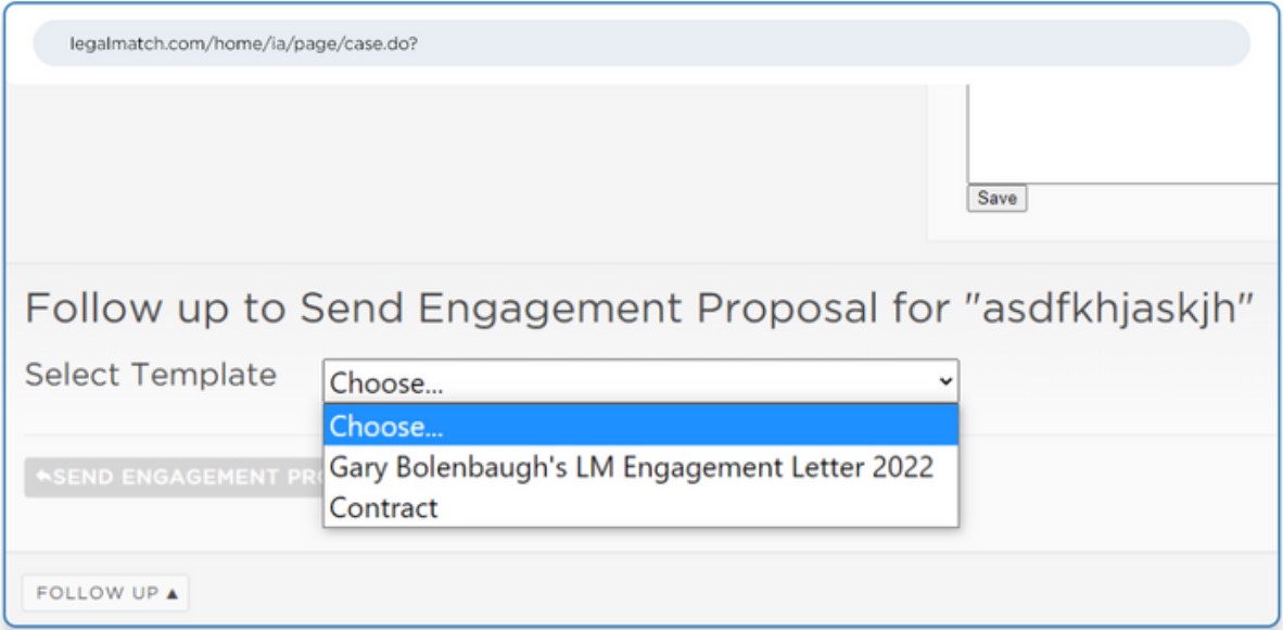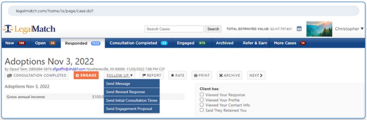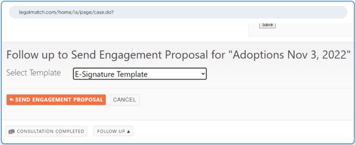 - Once setup, the attorney can now send an Engagement Proposal via the Follow Up button in the Responded, Consultation Completed and Engaged Tab accordingly.