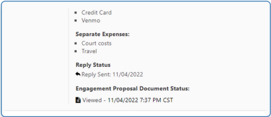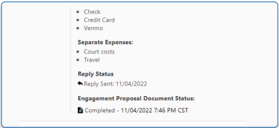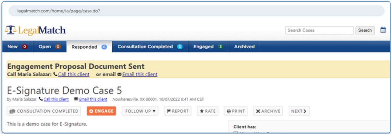 - From the top of the attorney dashboard, a banner should display Engagement Proposal Document Sent.