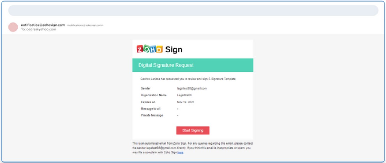- An email is then sent by Zoho to the client indicating the attorney request to sign the Engagement Proposal document.