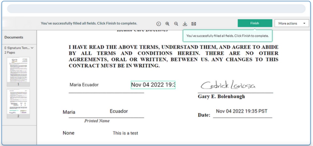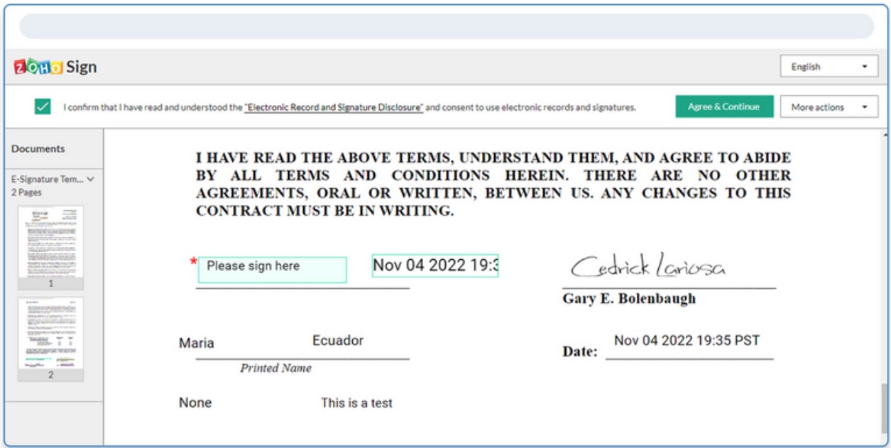 - Once the client clicks Start Signing, a new tab is open redirecting to the document in Zoho Sign dashboard.
