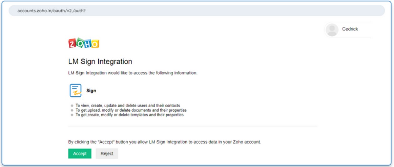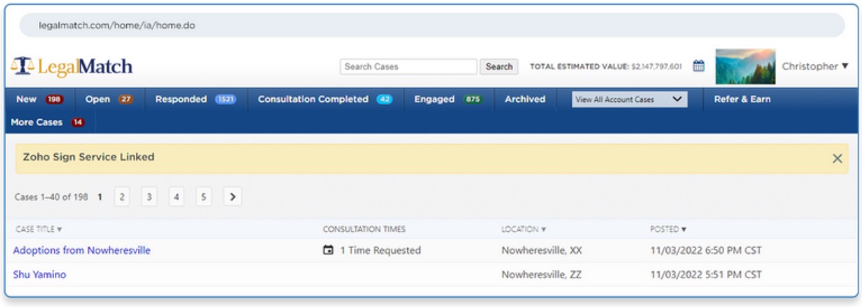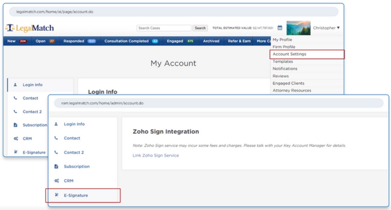 - Click Accept and attorney is navigated back to the dashboard with a banner Zoho Sign Service Linked.