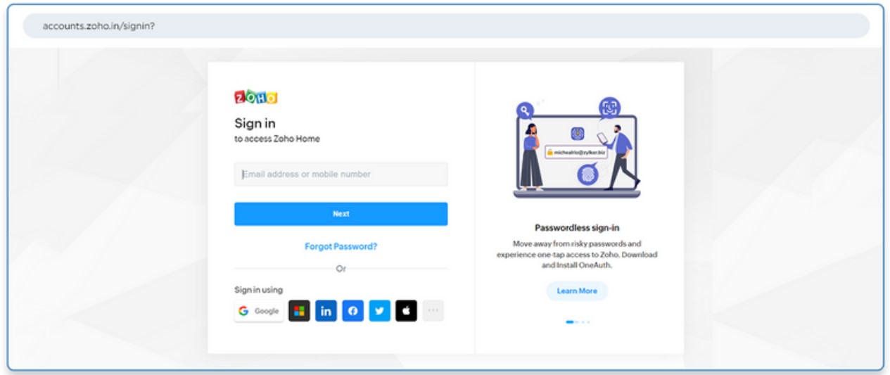 - For attorneys with existing ZohoSign account, input the username and password to login.