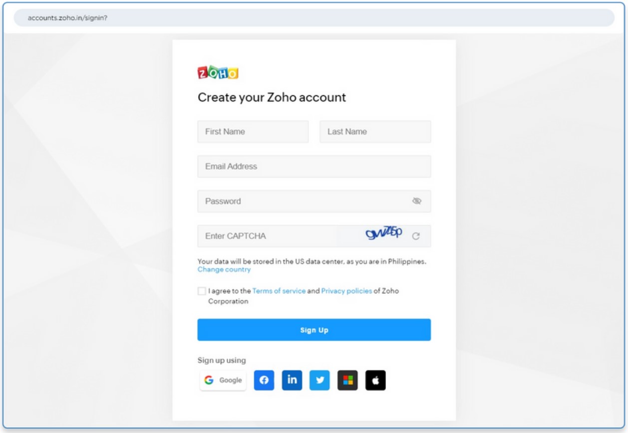 - For attorneys without existing Zoho accounts, click Sign Up Now, which will redirect to the registration page.