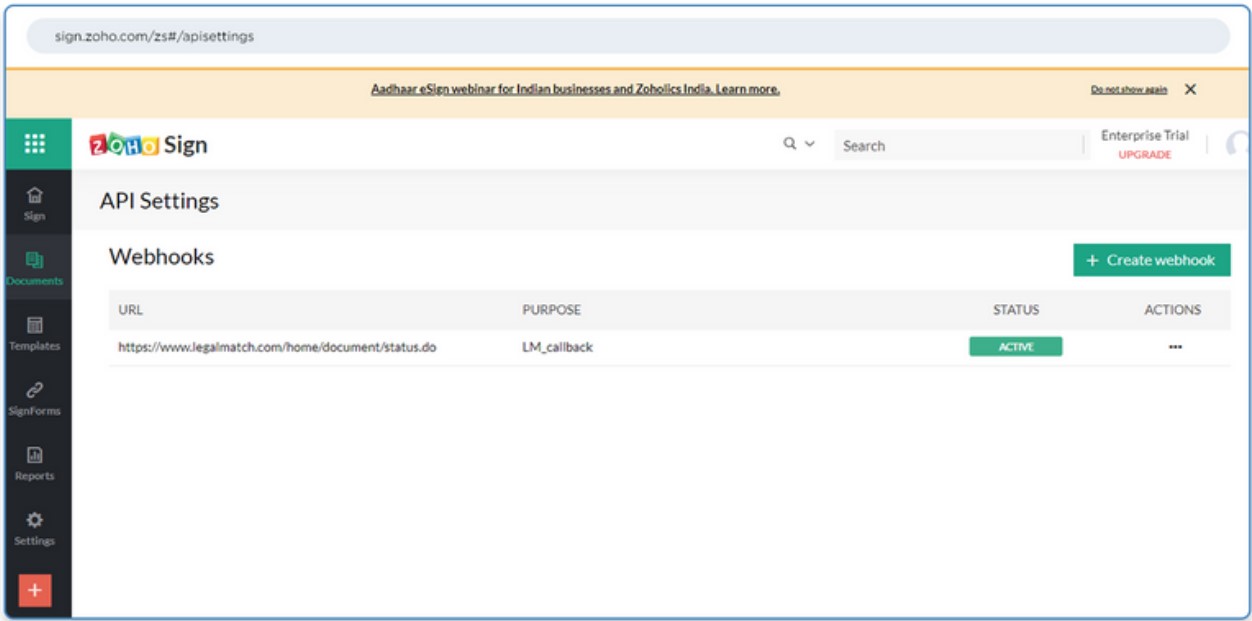 - At this point, once the Zoho Sign account is linked to the attorney, the callback is automatically generated in Zoho API Settings. Note: You may need to verify that this is created, otherwise the EP Document Status will not work as intended.