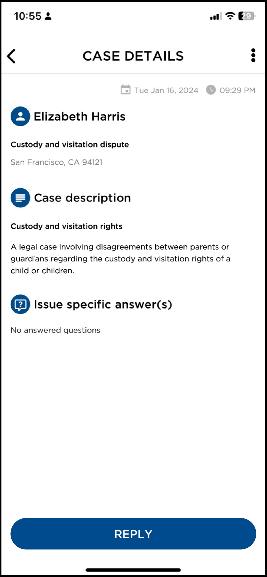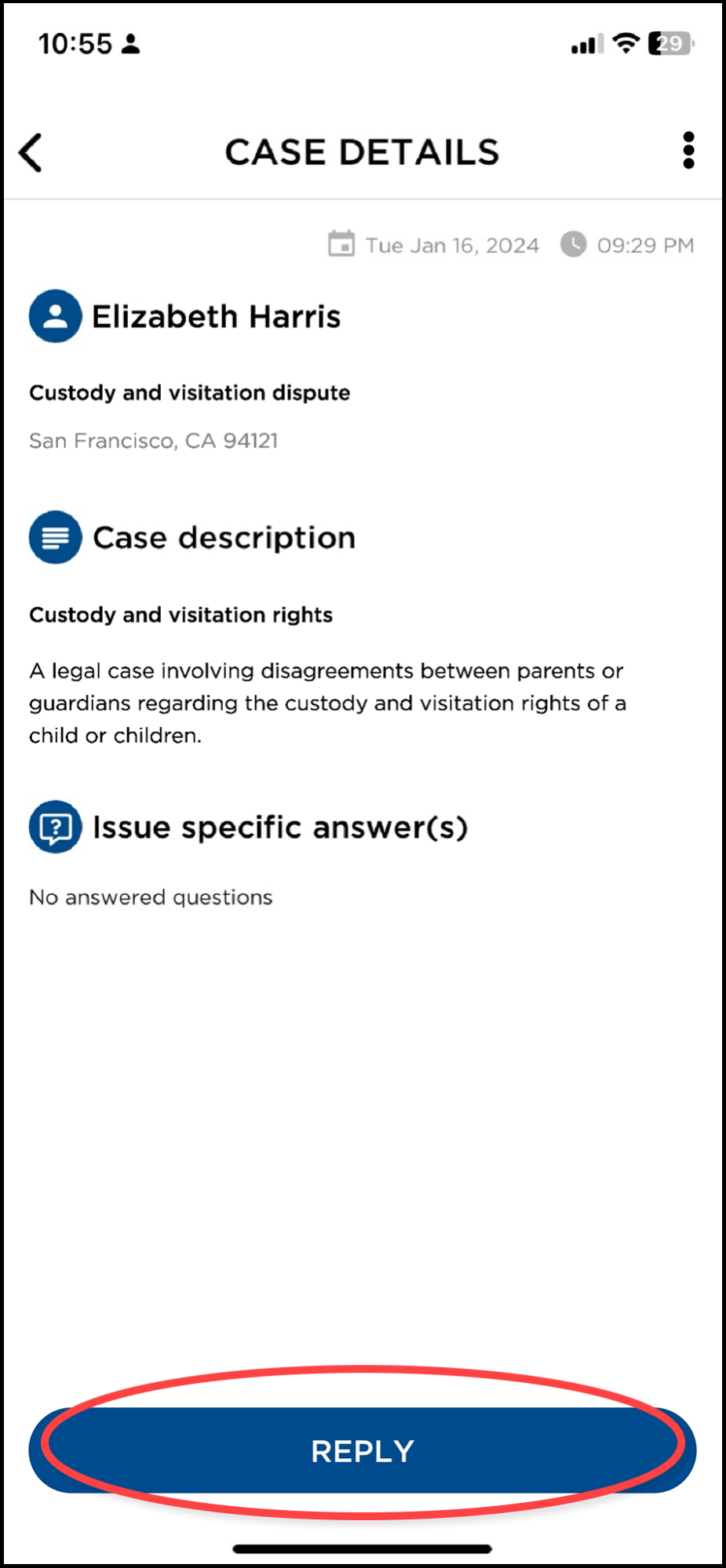 At the bottom of each case, you can tap REPLY to send one of your customizable response templates and gain access to case lead contact information.