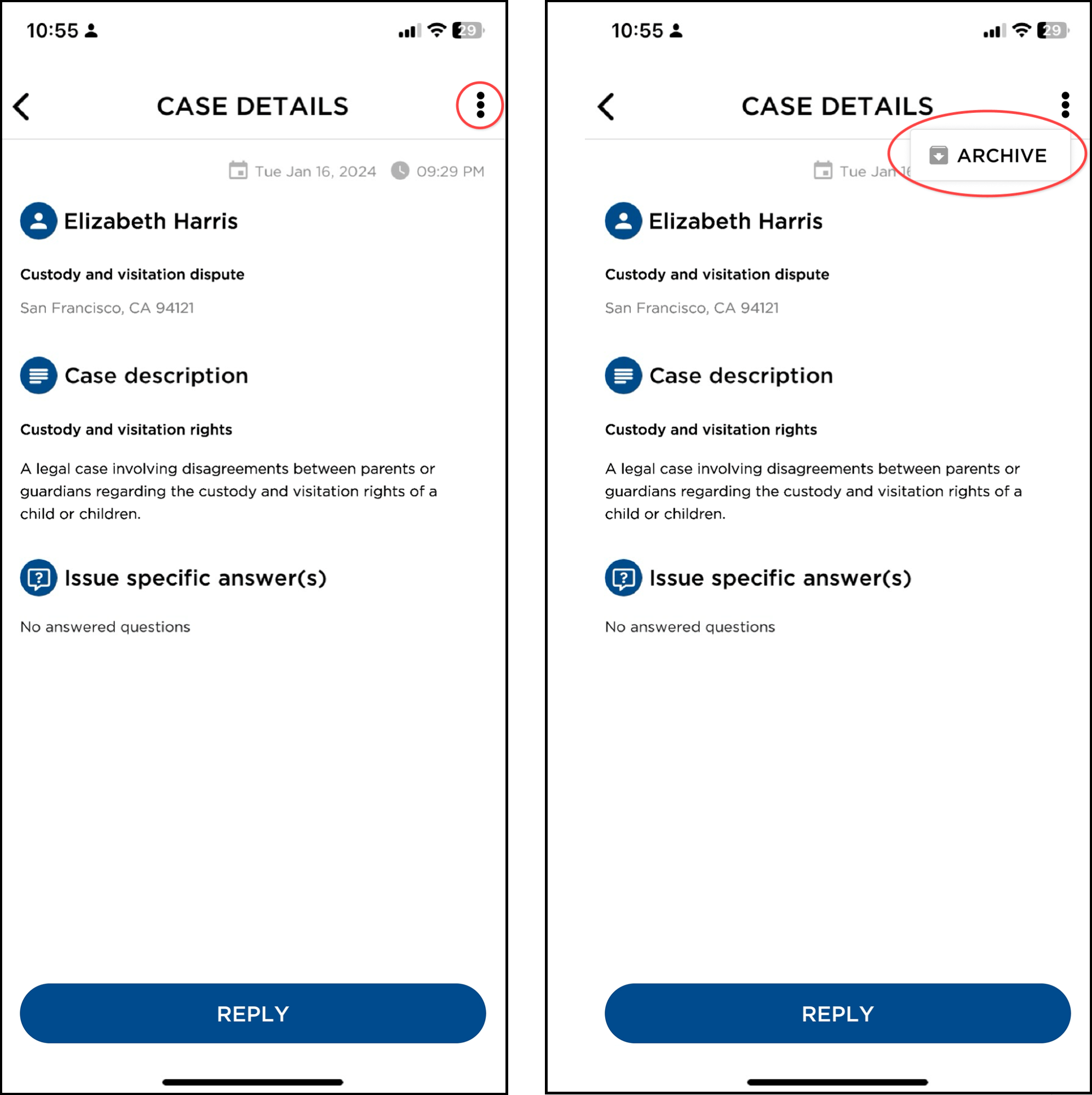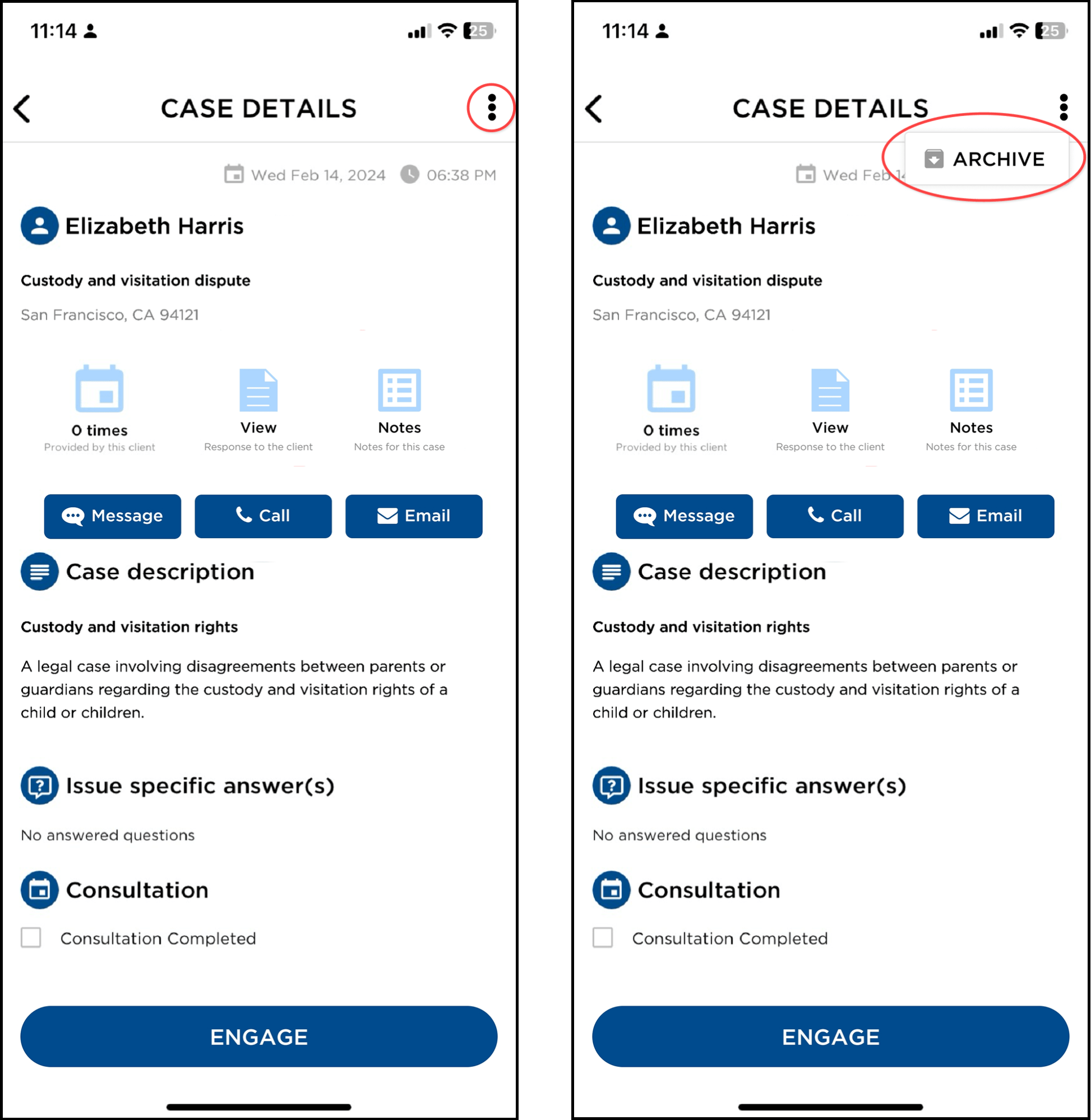To archive a case, simply tap the three-dot “kebab” menu to access that option.