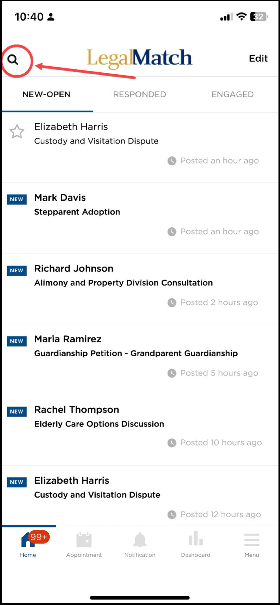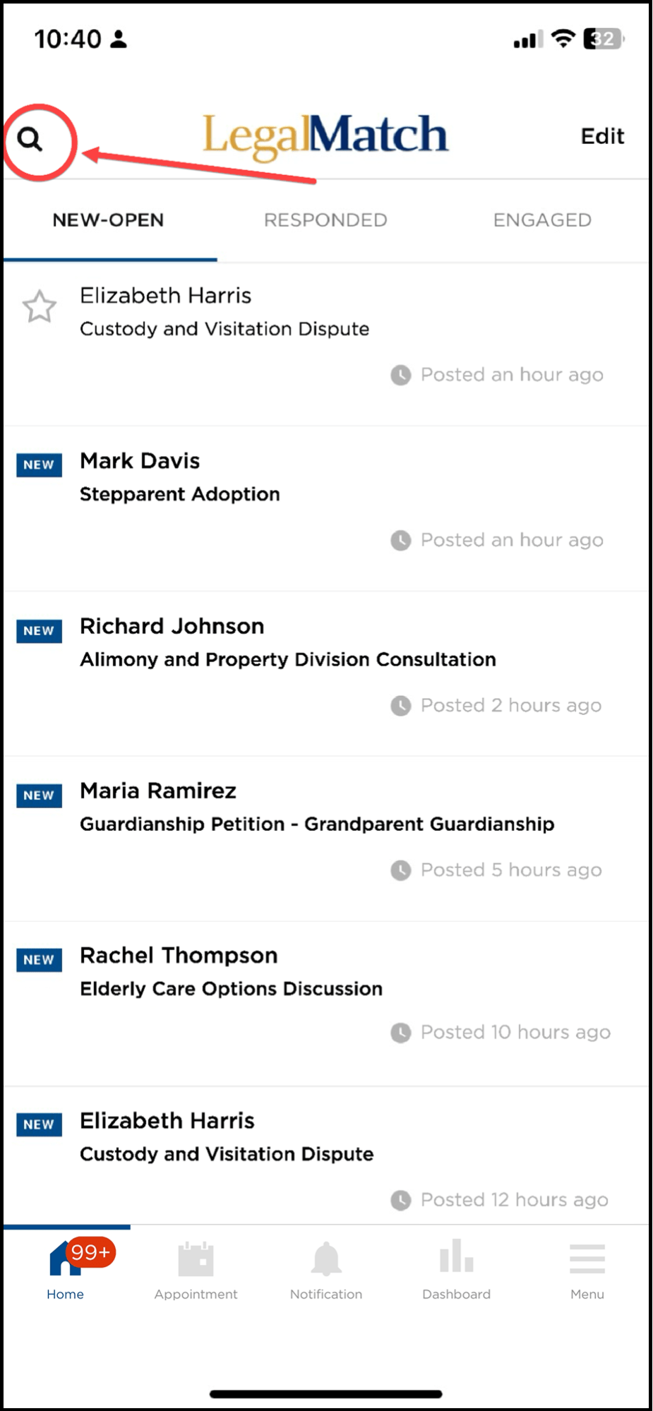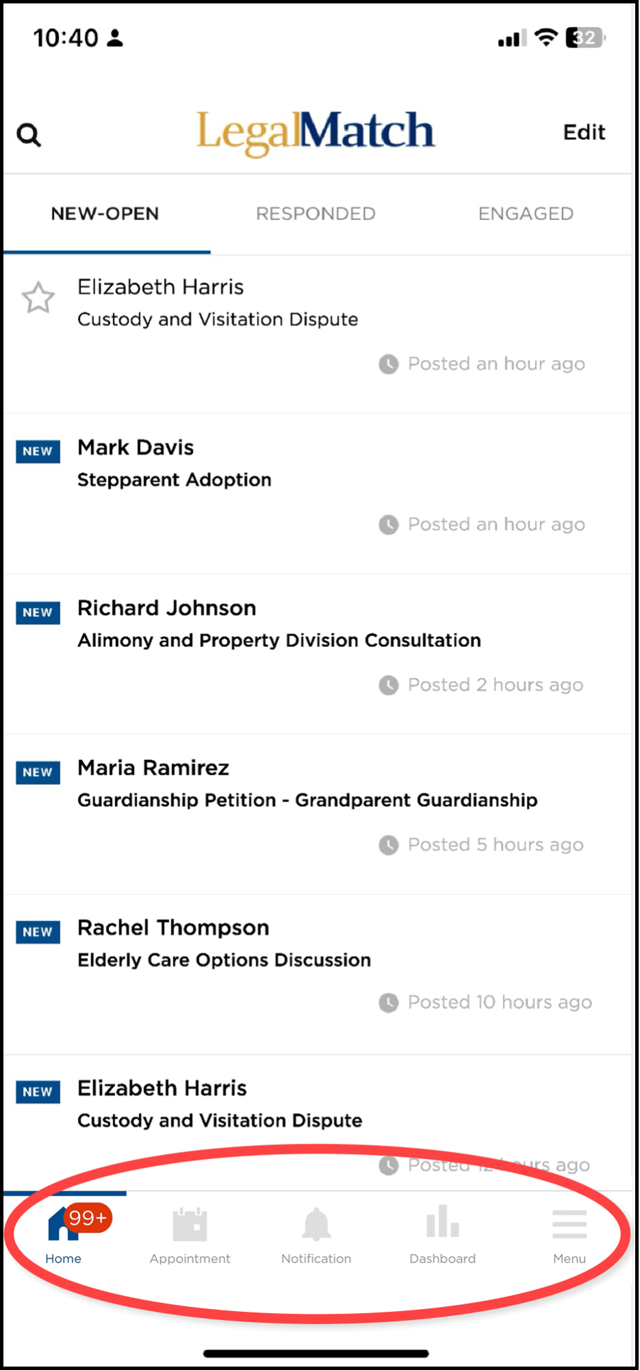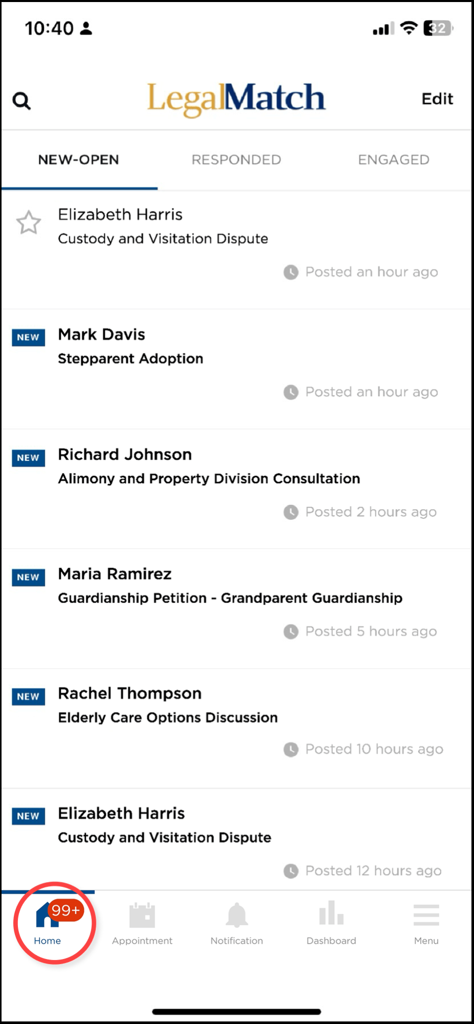 Tapping this allows you to return to the application homepage, which lets you view the NEW-OPEN cases page by default. The number on the homepage icon corresponds to the total number of new cases that have been matched to you.
