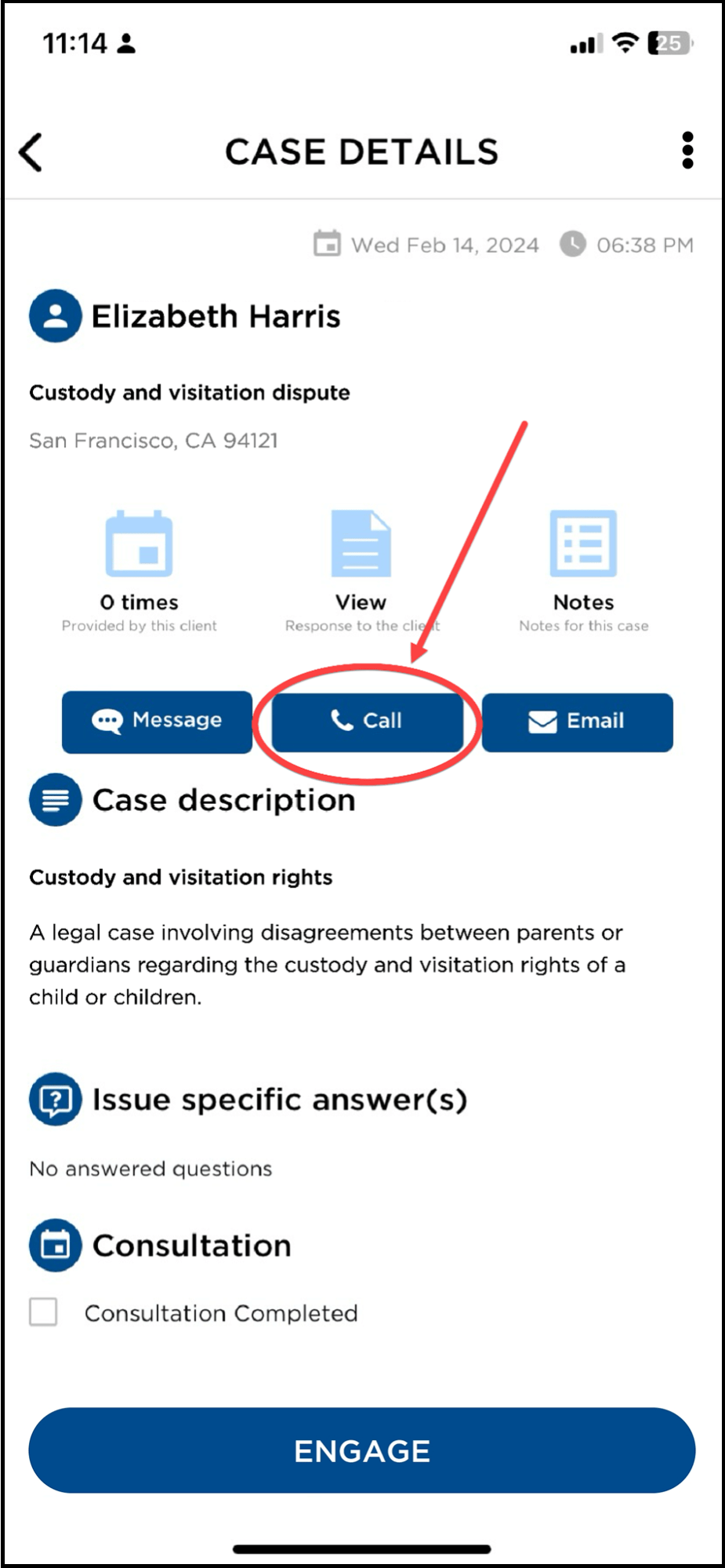 - Available call times provided by the client as well as the response template you sent and any case notes you’ve made (for your reference).