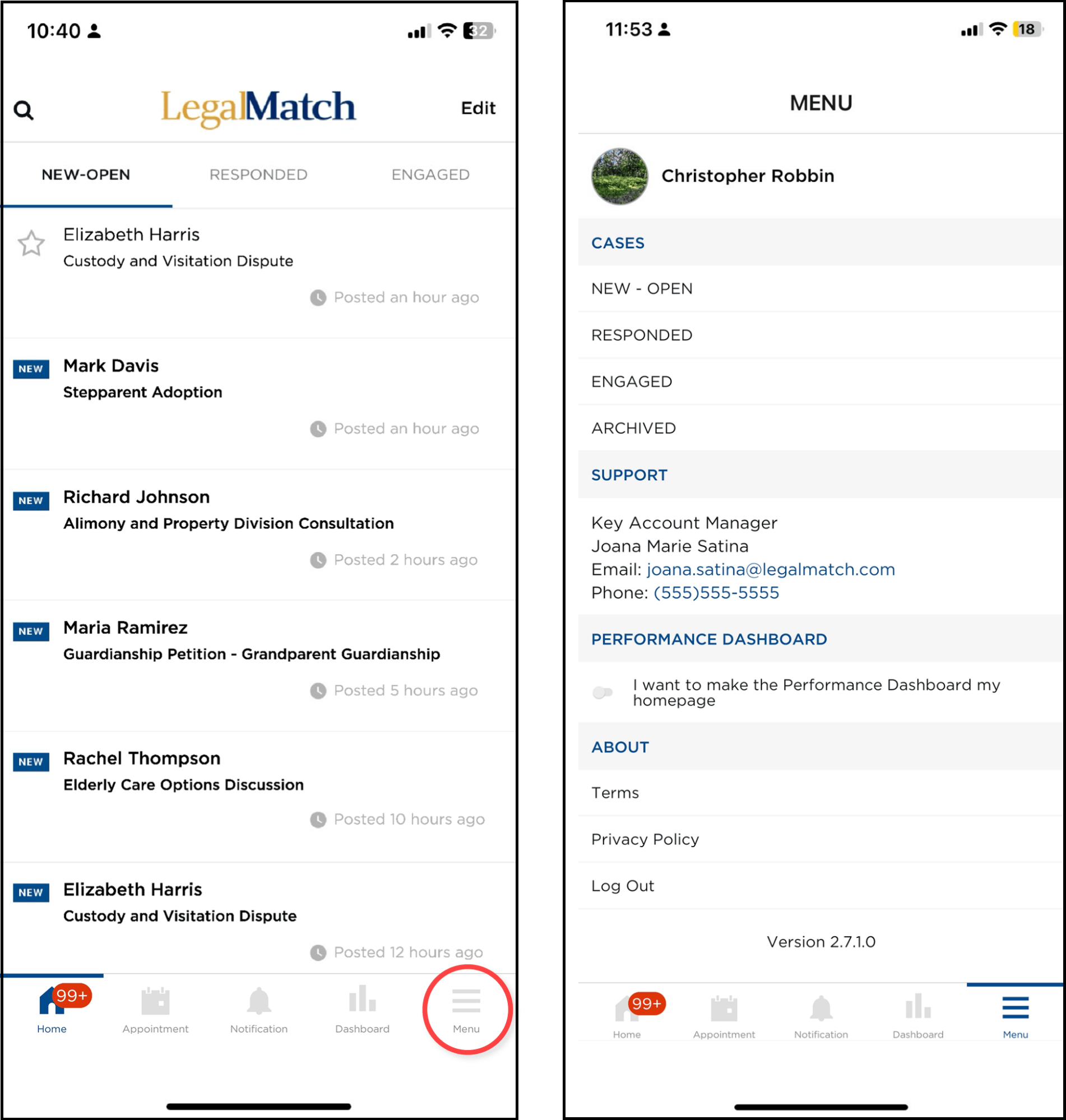 The hamburger icon (three lines) takes you to a page with a menu from which you can access all the case pages (NEW-OPEN, RESPONDED, ENGAGED, and ARCHIVED), as well as contact information for your dedicated Key Account Manager (KAM), the Terms and Privacy Policy pages, and the option to Log Out of the app.