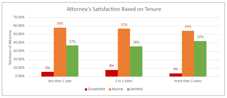 Notably, 42% of the Member Attorneys who have been with LM for more than 3 years said that they are satisfied with the features and assistance of LegalMatch in growing their business. There is a small percentage of those who expressed dissatisfaction, and consequently LegalMatch is relentless in addressing the concerns that contribute to their feedback.