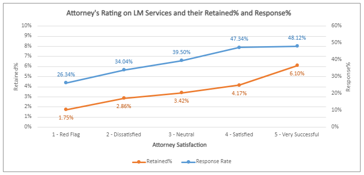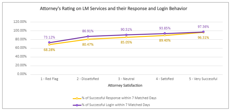 The second graph shows that satisfied and successful Attorneys have a higher percentage of Response and Log-in within seven matched days. Attorneys’ success in using LM services to transform leads into paying clients is attributed to their effort to Log-in on the app and react to posts.