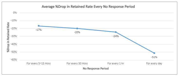 As reiterated, faster Response Time results into a substantial possibility of a successful engagement with the client, leading to a closed deal. The best time to respond to a case is within 5 minutes after clients posted it. This is proven by the observed decrease in the chance of engaging a client for every No Response Period, specifically a -17% drop for every 5-15 minutes of No Response, a -24% drop for every 1 hour, and a –51% drop for every day.