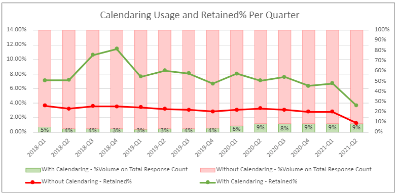 In a quarterly basis from 2018 until Q2 of 2021, Retained Rate of Lawyers that utilize the Calendaring feature has consistently higher Retained Rate than those Lawyers who do not use the feature. This is considering that Calendaring usage started to dominate on Q1 of 2020.